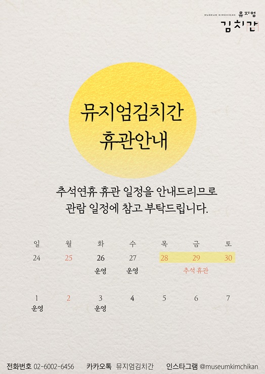 새로운 소식과 정보를 알려드립니다. 공지 %ec%96%b8%eb%a1%a0%ec%b7%a8%ec%9e%ac %eb%b0%8f %eb%b3%b4%eb%8f%84 제목 [안내] 뮤지엄김치간 추석연휴 휴관 안내 (2023.09.28~09.30) 등록일 2023년 09월 26일 조회 8475 안녕하세요, 뮤지엄김치간입니다.추석연휴를 맞이해 뮤지엄김치간 휴관일정을 안내 드립니다.관람에 참고 부탁드립니다. 즐거운 한가위 되세요.감사합니다. 목록보기 다음글 이전글